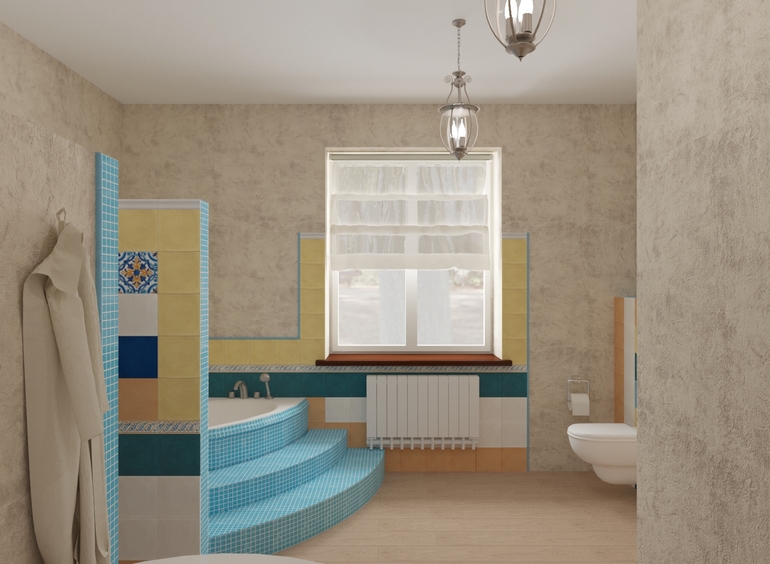 Я бы все же стеклянную сделала душевую, смотрится воздушнее. Хотя место там у ас позволяет сделать перегородку. И тоже за лавочку, это очень удобно. А унитаз и раковину тогда можно перенести ко входу. Получится у окна зона релакса, а у входа зона "быстрых дел". Подумайте начет биде, место позволяет. И не увлекайтесь разного цвета плиткой. Посмотрите картинки западных интерьеров - сочетание одного - двух видов плитки и краски либо штукатурки. Интересно играют с разной раскладкой, как на картинках выше. Именно это и создает южный теплый интерьер.