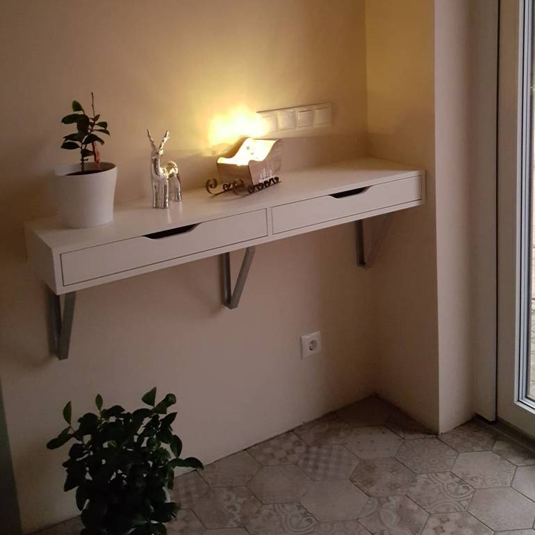 это фото нашего тамбура. Купили вот такую полку- консоль в икее. Очень нравится. Особенно цена). Никак не могла найти консоль за вменяемую цену.
