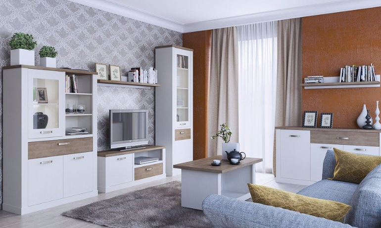 Если нет нужды организовывать хранение в гостиной, я бы ограничилась тумбой под ТВ и диваном/креслом. И цвет лучше дерево