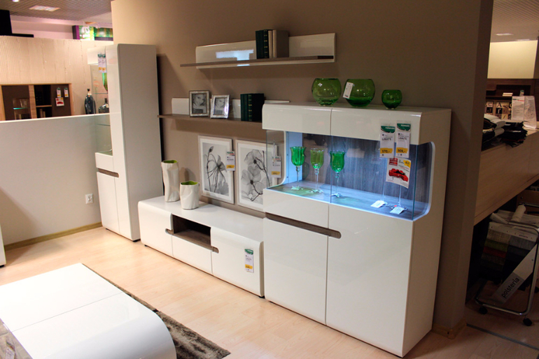 Я бы в гостинную стенку не ставила, максимум нижний ряд ящиков р мягкую зону. ведь получается какое-то продолжение кухни. Ну мне так кажется. Смотрите в плане удобства и мест хранения в квартире.