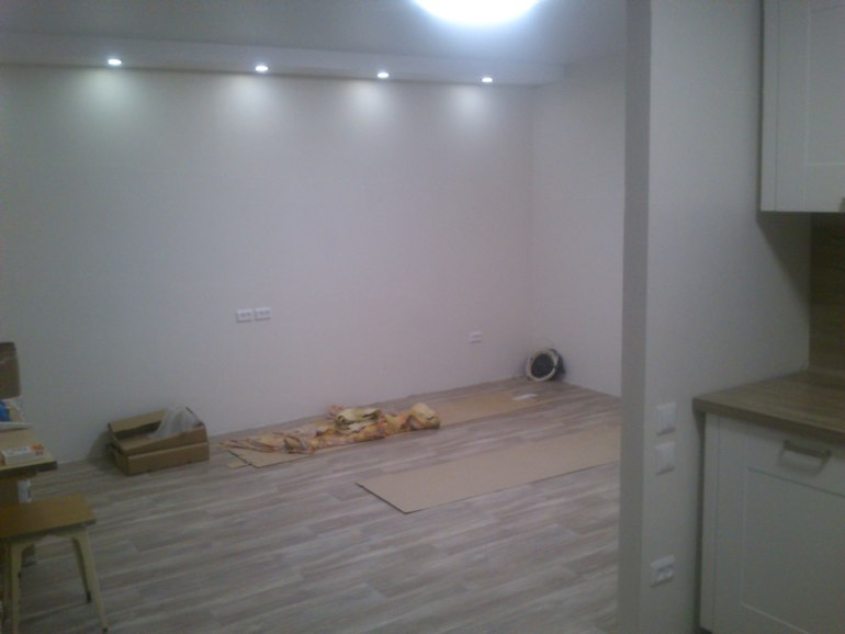 Я бы мебель в гостиную сделала цвета, как каркас кухни. Не темный и не светлый. На светлом фоне стен красиво будет. И подвесные шкафы внизу под телевизором, типо бесты из Икеи.