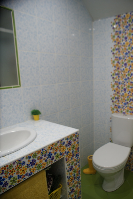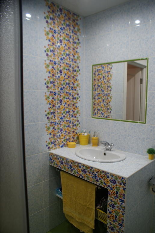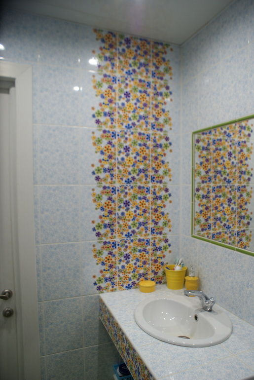 У нас частный дом и так получилось, что большая ванная и туалет у нас на первом этаже, а этот с/у получился компактненьким). Я до сих пор помню как объехала два раза город в поисках плитки и изначально, как это часто бывает, планировала другую цветовую гамму и стиль. Эти цветочки были последними, что я увидела/нафоткала в процессе выбора и не сказать, что прямо влюбилась, но решилась... и, к слову, не пожалела о своем выборе.