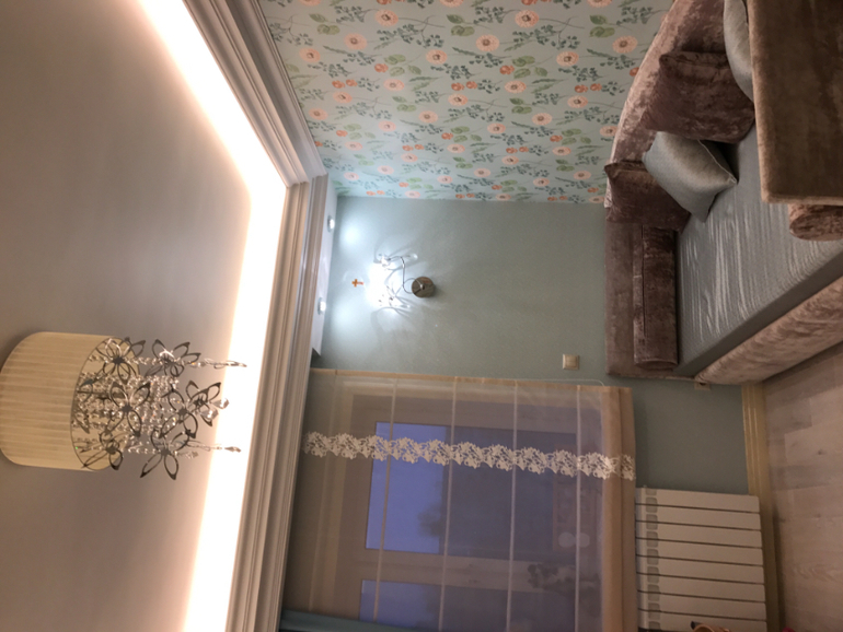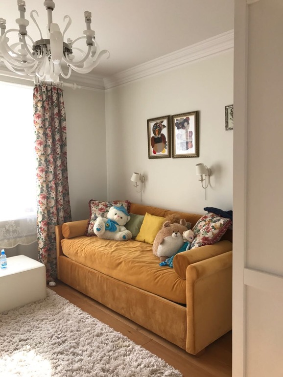 Люстра, конечно, не для детской, но вполне терпима. Она лучше бы смотрелась, если бы обои были однотонные)) Больше меня смущают шкафы у дери: они разной глубины и на разном расстоянии от двери. Я понимаю, что один из них бельевой, но все же... И потолок это еще подчеркивает. Надо было сделать общий шкаф, а входную дверь - его средней дверью, например. А вот диван мне как раз очень нравится)) Он российского производства? У меня в одном проекте есть похожий итальянский диван в детской.