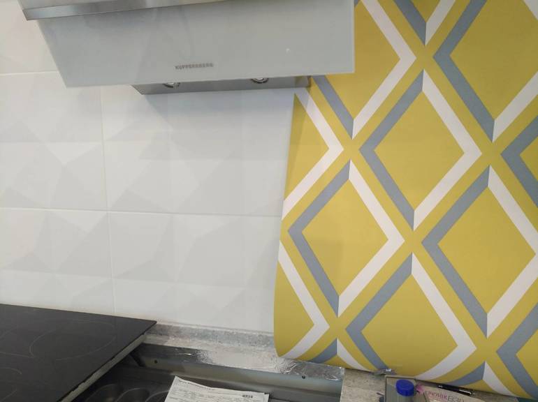 у нас керамогранит прям точь-в-точь как треугольники на обоях))) смотрится здорово! не пожалела, что их выбрала. И обои будут хорошо смотреться