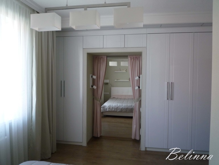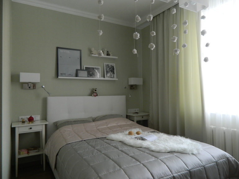 Делала спальню сестре. Обои фисташковые, кровать, шкаф, бра, люстра - белые. Шторы - в цвет стен максимально, покрывало двустороннее, нежно-розовое и серое из той же коллекции ткани, что и шторы. Позже сфоткаю.