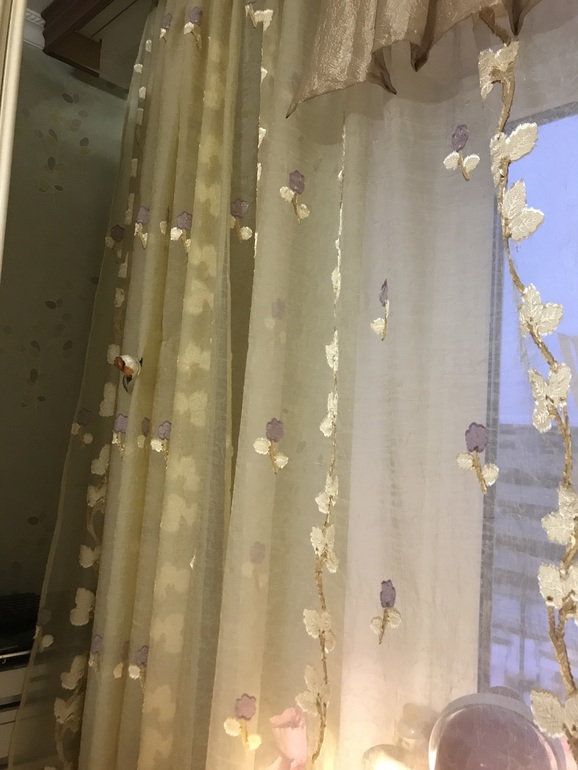 У дочери похожие обои, только ещё веточки редкие с золотистыми и лавандовыми листочками. У нас мебель стоит прагматика серия прованс (она светлая с фисташковыми и бежевыми вензелями), тюль бежевая с лавандовыми и зелёными лепестками, шторы бежевые. Пол и дверь коричневые (орех какой-то).