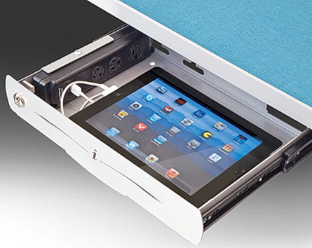 Идея относительно расположения розеток для зарядки вашей мобильной электроники и прочего внутри ящиков вашего стола сэкономит кучу места и не испортит внешний вид.