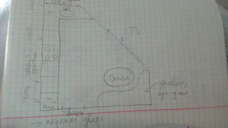 Кухню не расширить. В салонах мне предлагают расположить кух.гарнитур примерно как ольга нарисовала, но просто шкафы на полстены , а дальше зона телевизора, но из-за тупого угла трудно добиться симметрии в шкафах, что мне не нравится.
