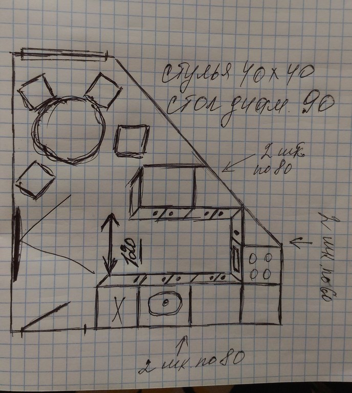 зона готовки, без барной стойки, с шкафами, по фасадам по 80 см, где плита по 60. Обеденная зона уже после, можно подбирать по размерам удобный стол, вот круглый 90 см в диаметре, стулья по 40 посадочное место и в таком положении они не бывают практически, а полузадвинутые. Масштаб рисунка: одна клетка - 20 см.