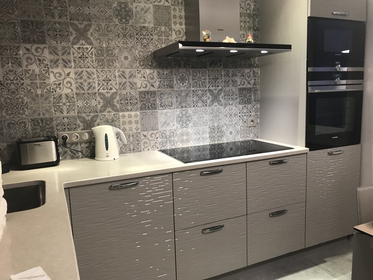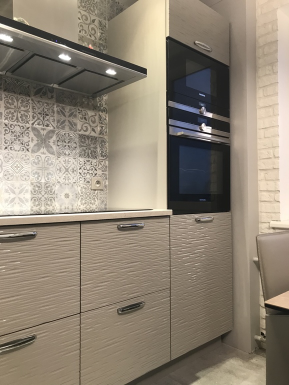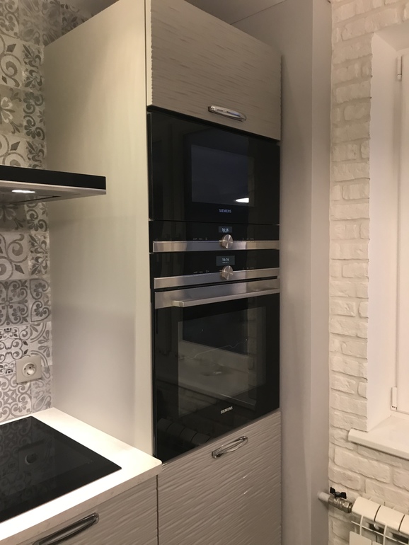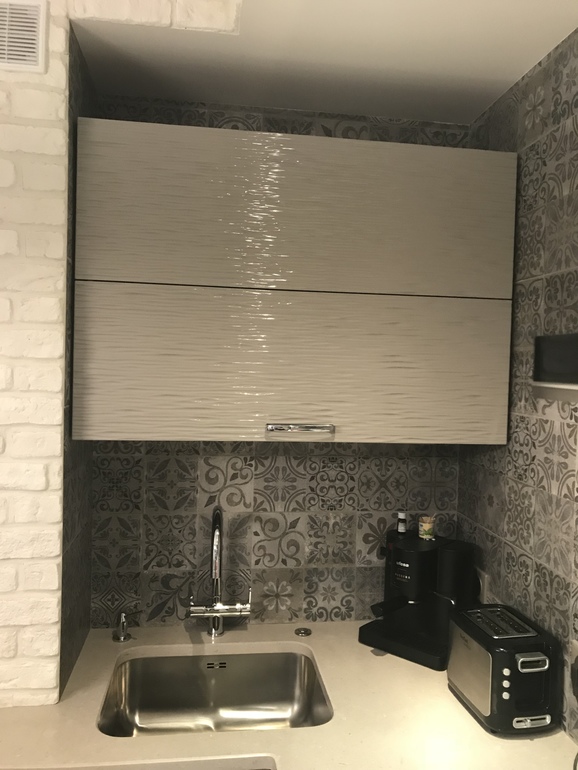 На прошлой квартире кухня была не такая уж и маленькая, 8,5 кв.м, но мы ее сделали в тёмной мебели и чёрная столешница была, со временем, так давить стала, народу в доме полно, да и гости у нас постоянно, и ещё эта тёмная мебель. Поэтому в новую кухню решили не вешать верхние фасады, только сушку. Сейчас думаю, что сушку нужно было сделать обычным шкафчиком, а посуду в выдвижной складывать, но привычки своё берут.