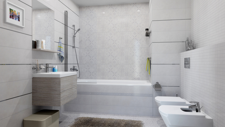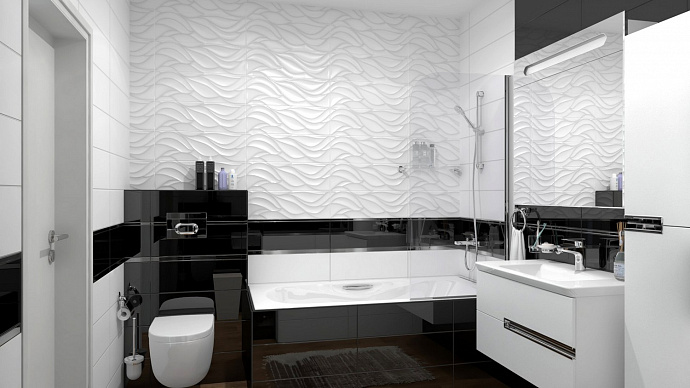 Мне нравится 1 вариант, очень стильно и модно, вообще очень люблю эти 3 д плитки, но все таки взяла бы за место черного, в дополнение к белому другой цвет, или если нравится черный,то уменьшит его количество. Особенно возле унитаза