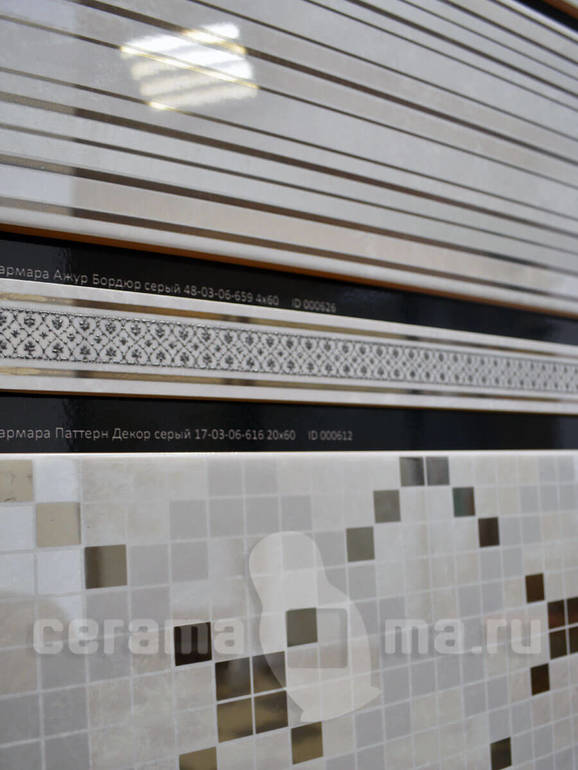 Третья глянцевая,декор с металлическим блеском,два вида основной плитки-серый и тёмно серый под мрамор