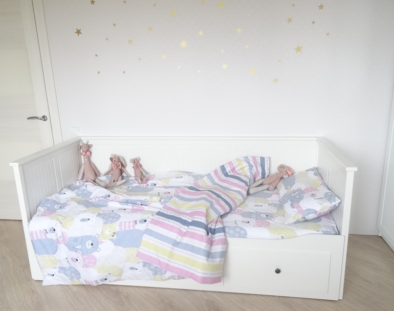 Там же, в икеа приобрели покрывало, подходящее к общей гамме. На фото его немного видно.