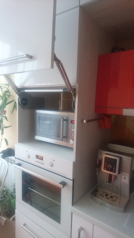 Посудомойка, встроенная в шкаф вытяжка, встроенная микроволновка и духовка в колонне, смеситель с двойным изливом для фильтрованной воды, дозатор для моющего средства встроенный под столешницу. Столешница из камня и мойка подстольного монтажа. Сушка для посуды с дверцей с подъемным механизмом (складывающийся). Холодильник со складывающейся полкой, очень удобно ставить большие кастрюли, не нужно вынимать или переставлять полки.
