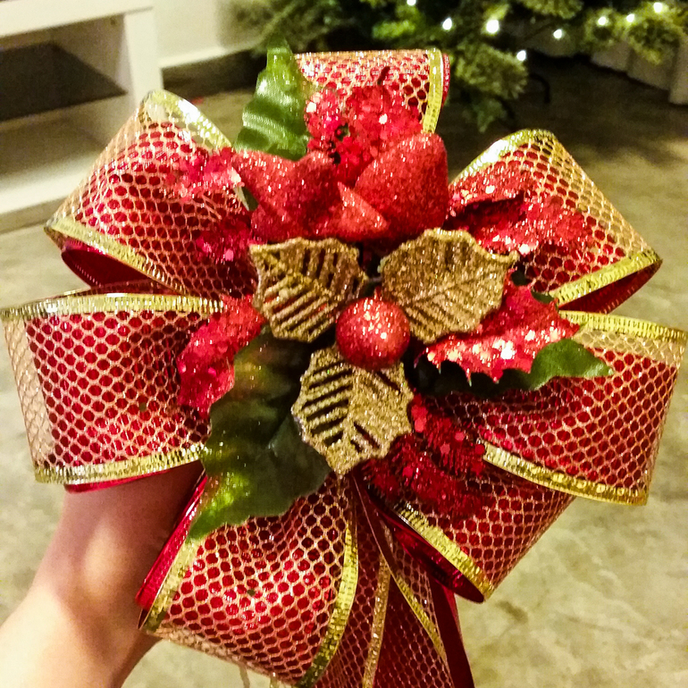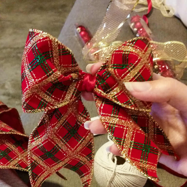 Из клетчатой ленты с люрексом я сделала несколько классических бантиков, они прекрасно дополнили образ моей елочки.
