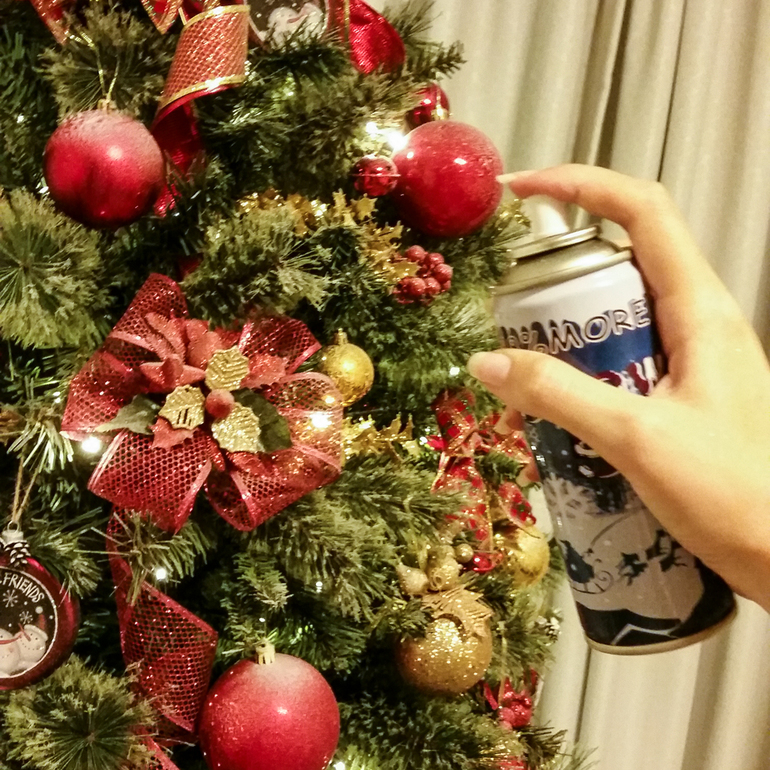 После того, как я составила основную композицию, я посыпала елку «снегом» из баллончика.