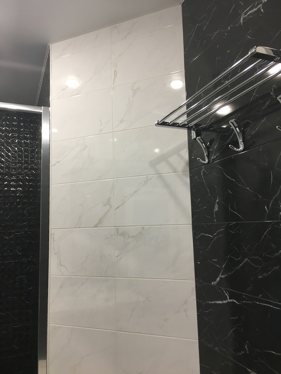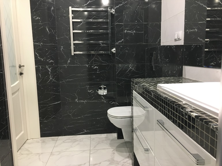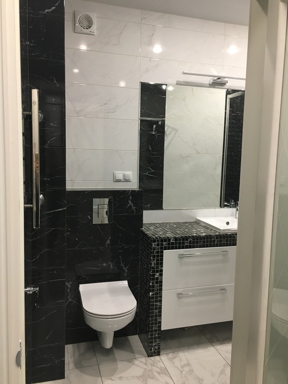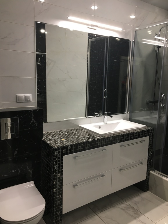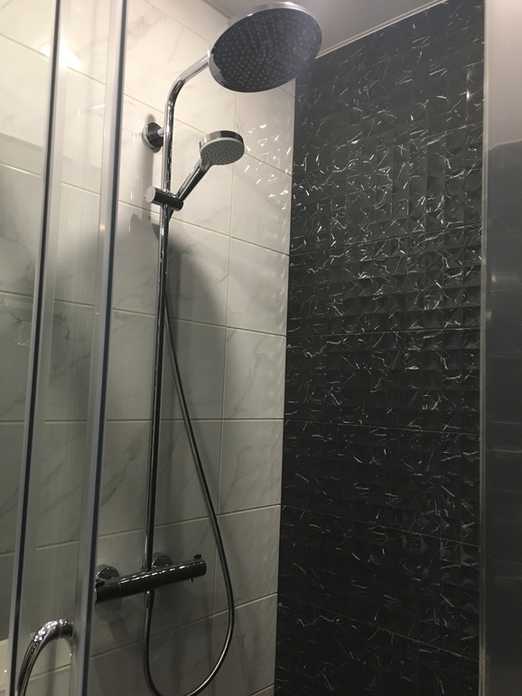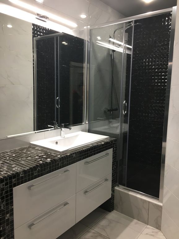 Естественно туда напрашивался только душ, в принципе в ванной лежу редко, поэтому не особо переживала , что у нас её не будет. Единственное , что скорее всего возникнут трудности с маленьким ребёнком, который вот-вот появится)) Выставляю фото на ваш суд, про непрактичность все понимаю, и плитка чёрная и зеркало и стекло в душе не дадут мне заскучать))