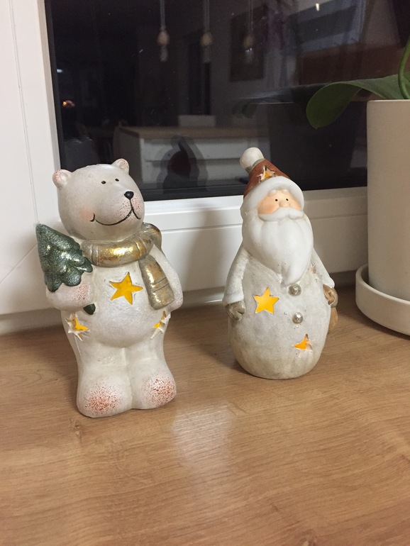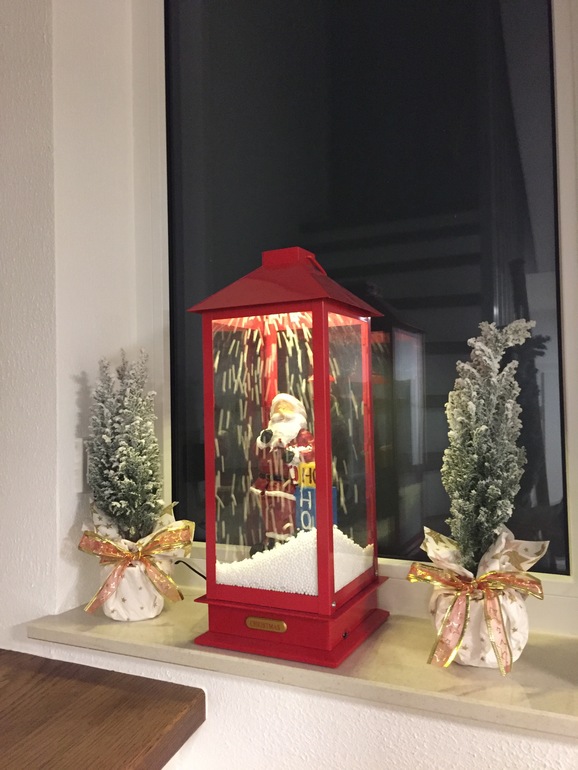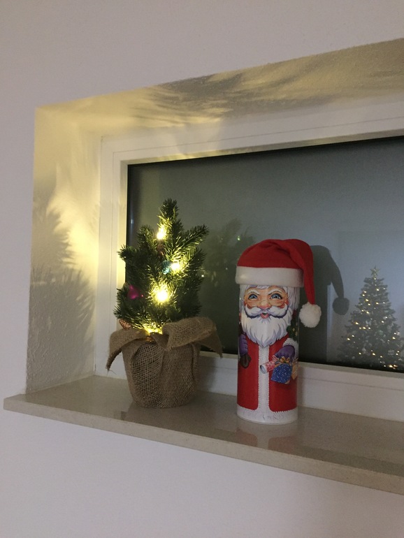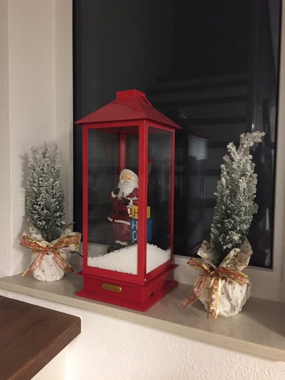 На лестничной площадке поставили вот такого Санта Клауса с живыми елочками, которые надо периодически поливать.