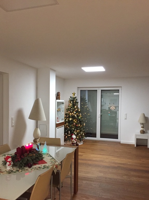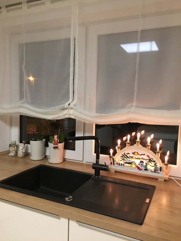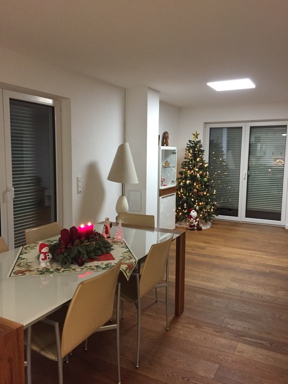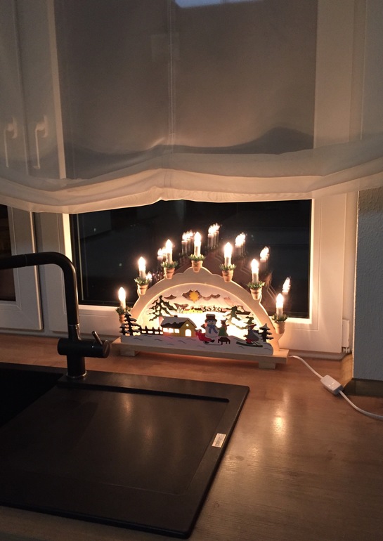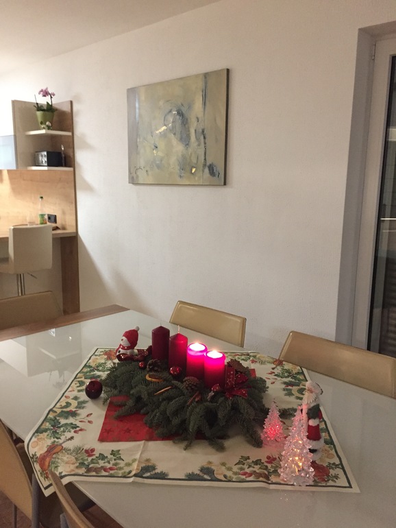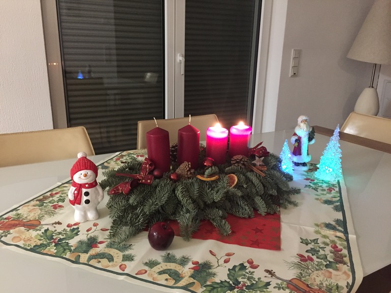 На столе поставили покупной Adventskranz. Можно было бы самой такой сделать, но времени и сильного желания не было. В это воскресенье зажигаем 3-ю свечу. Веточки не искусственные и пахнут ! А елочки меняют постоянно цвета,
