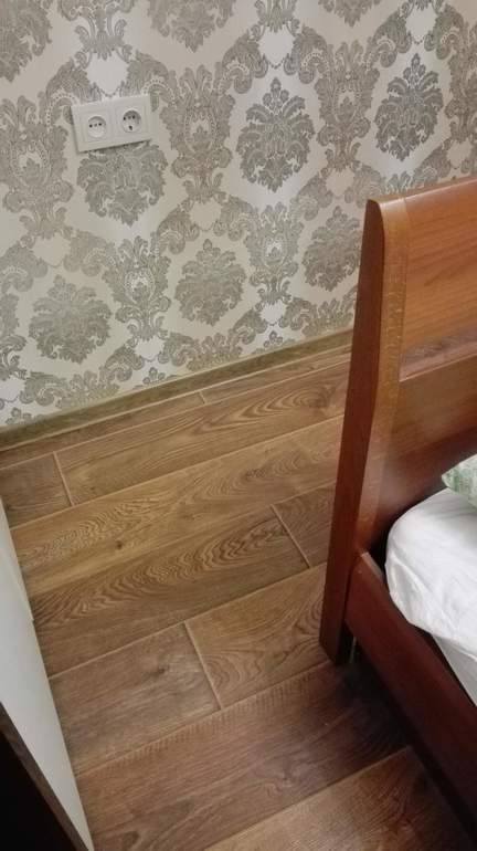 Вам надо было кровать без изножья взять. Тогда бы влез туалетный столик. И зеркало бы,как раз в тему, висело над столиком. А так к чему Вам там вообще это зеркало? У нас такое же примерно расстояние между кроватью и стеной напротив. Я без туалетного столика спальню вообще не представляю). А к чему Вы плинтус подбирали? Вроде ни к полу, ни к дверям не подходит.