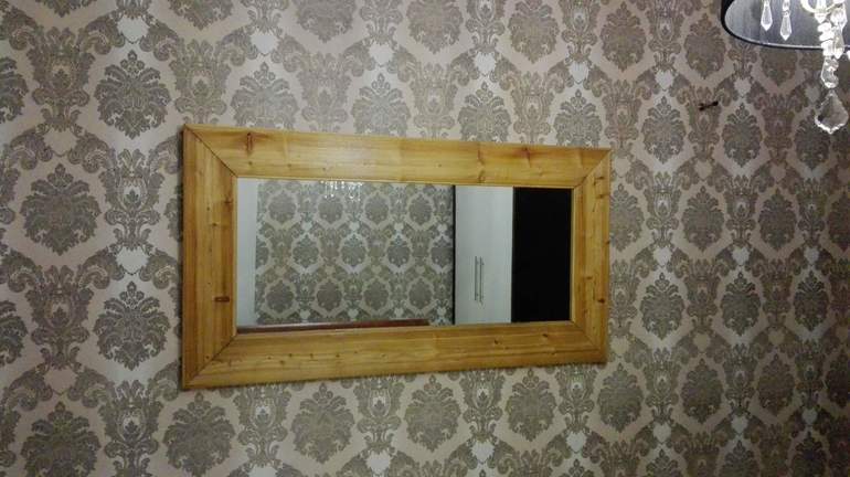 Вопросы и ответыВсем добрый вечер, помогите подобрать правильный оттенок рамы зеркала. Оно очень большое 150*75 и висит напротив кровати. Делали сами, рама лиственница, лак был прозрачный в банке, но цвет получился желтоватый. Когда наклеили обои, поняли, что не подходит оттенок. Хочется чего то яркого может красный? Кто какой цвет видит? (для тех кому интересно человек в нем не отражается когда спит). Штор еще нет, ремонт еще идет. Кто владеет дизайнерскими программами можете поприкладывать оттенки. Что будет смотреться на стене. Коричневый не хочу, пол коричневый и двери и стенка шкафа...