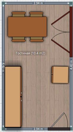 Или придумать разделение на зоны - ширму или стойку барную в середине комнаты, впритык к гарнитуру, а уже от ширмы ставить мебель столовой, по идее, должны влезть и диванчики, если их хотите. Но нужно будет стойку с техникой у правой стены сдвинуть вниз, чтобы проход нормальный был. Телек не знаю куда, у Вас вроде там окно, где логично было бы телек вешать