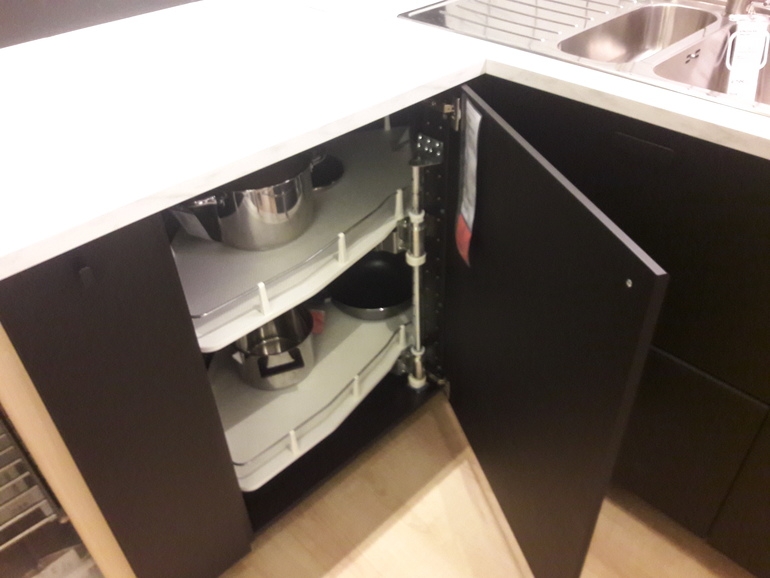 А если сделать в углу мойку и соответственно под ней мусорное ведро, то весь этот большой объем шкафа пропадает( не удобно будет там что-то хранить