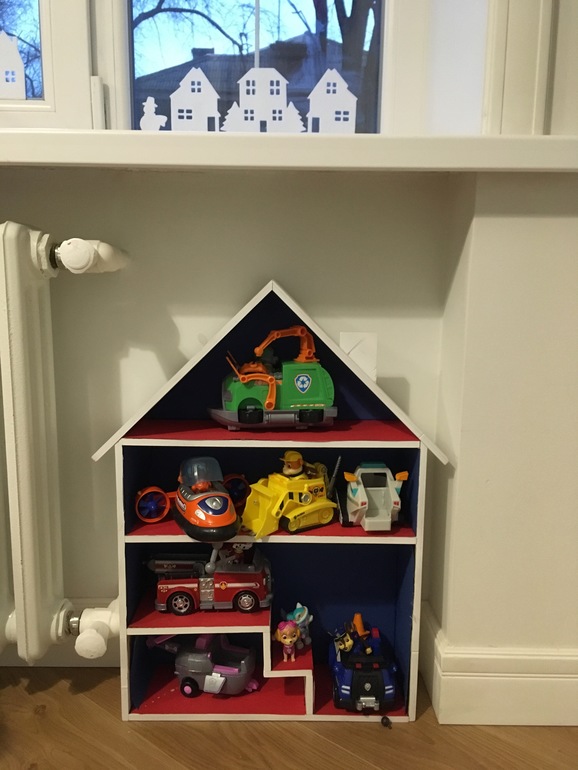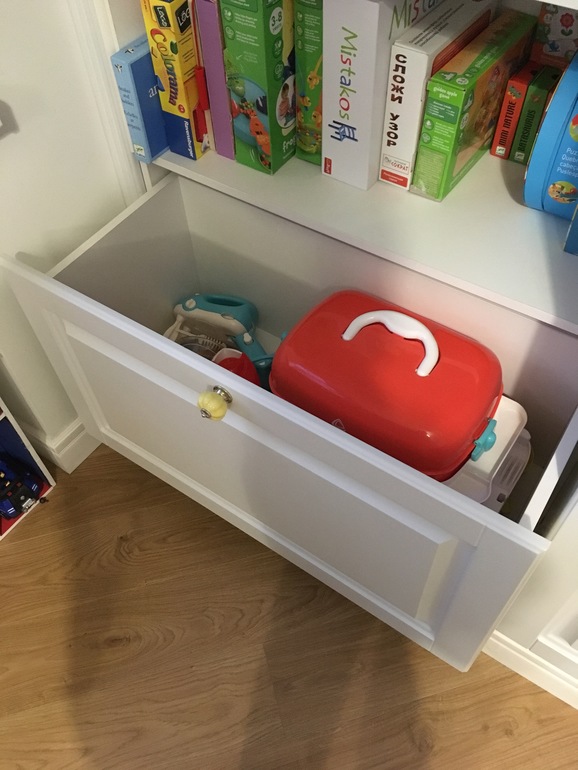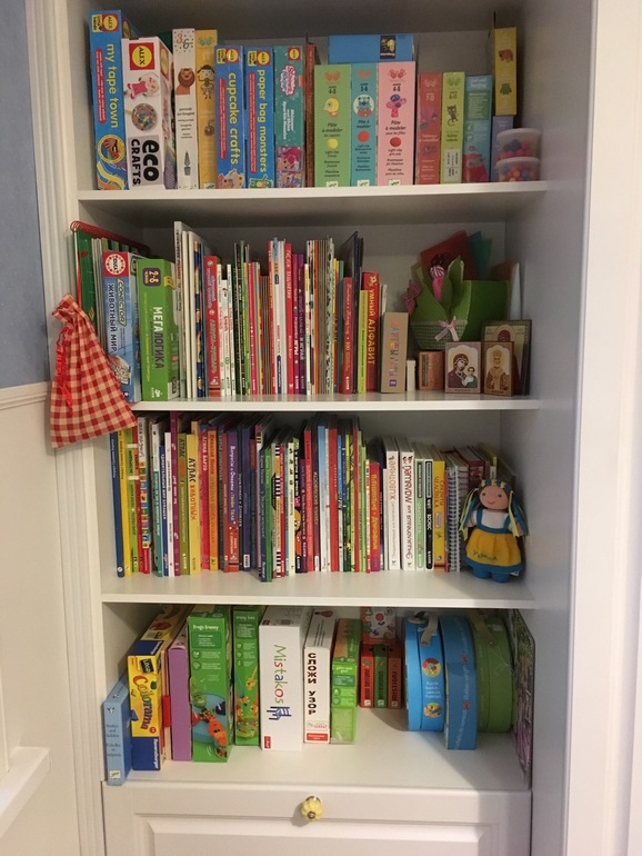 Внизу настолки-пазлы, выше книги, потом обучение, и творческие наборы. Внизу выдвижной ящик там кухня.