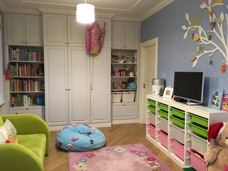 Система в хранения в деской удалась мне на все 100%, за полтора года я ни капли не разочаровалась в труфасте и в том что по бокам шкафа сделала открытые полки.