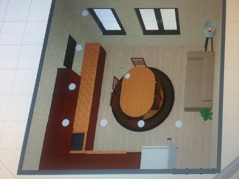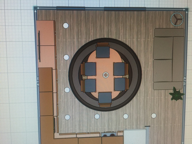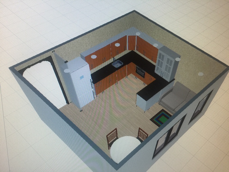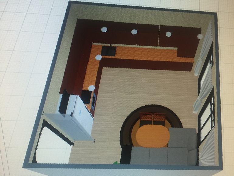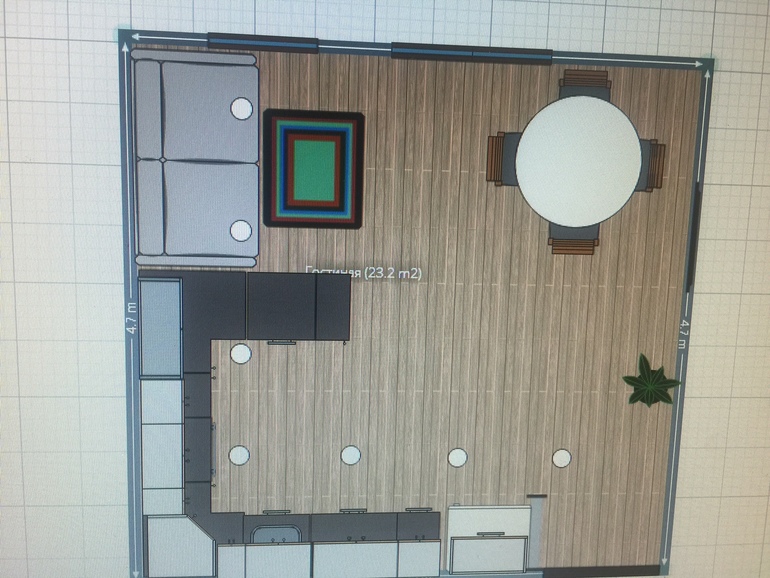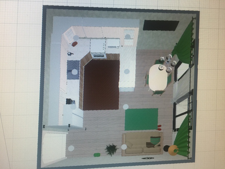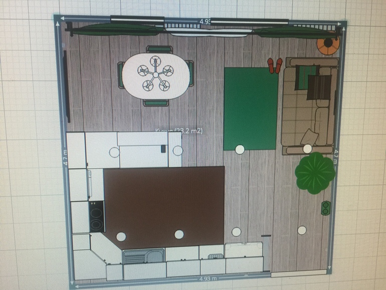 Интерьерное решение кухниДевочки, пожалуйста помогите расставить мебель в кухне. что мы имеем, кухню-столовую длина 4,9м ширина 4,7 м. Имеются 5 вариантов, но самый мой любимый это 1 вариант с островом, но ни как не получается пока уговорить мужа (говорит что не поместится все, хотя я в программе сделала все измерения, и все ОК, но это не аргумент(((() Он предлагает 4 и 5 вариант, мне совершенно не нравится... Я очень хочу сделать по зонам, что бы когда я готовила мне никто не мешал и я соответственно ни кому. При входе слева у нас уже заложена стена (ниша) 77 см. На цвета кухни не смотрите, я хочу всю квартиру в светлых тонах, хоть в этом мы с мужем солидарны.