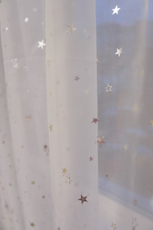 Сквозь нее с улицы ничего не видно, только размытые очертания (а у нас второй этаж, это актуально). А серебристые звездочки так классно мерцают в свете ночника! Люблю сидеть вечером у сына, пока он засыпает, любоваться на звездочки и на гаснущие окна в доме напротив! Для меня эти горящие окошки - просто верх уюта, что-то такое из детства! Я выросла в таком же примерно доме ))