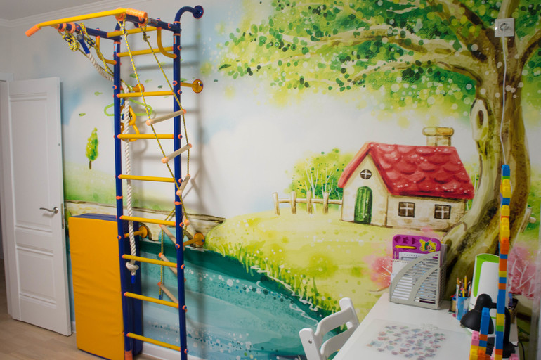На стене панно от Divino, все сначала думают, что это роспись )) В комнате у сына всегда дует теплый летний ветерок! Остальные стены оклеены обоями под покраску, которые мы не красили.