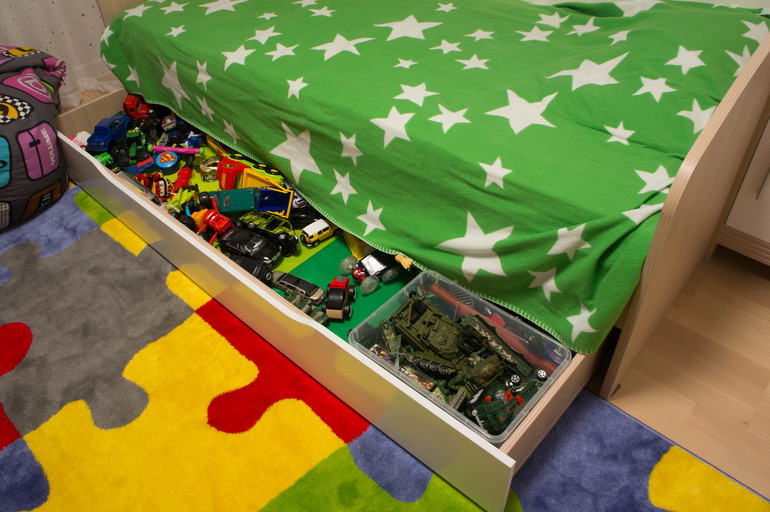 А пока не вырос, все его игрушки прячутся под кроватью и в стеллажах! Хранить тонну мелочевки под кроватью оказалось очень удобно! Выдвинул и все на виду, бери что хочешь, поиграл - скинул все обратно, задвинул и в комнате порядок!