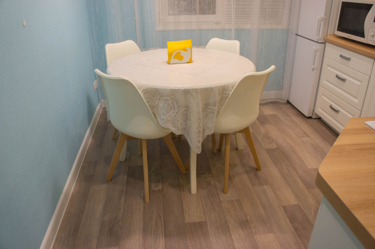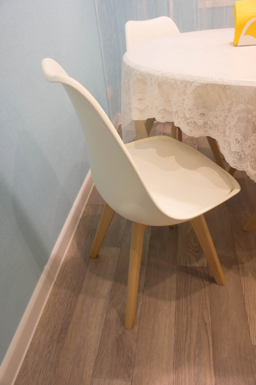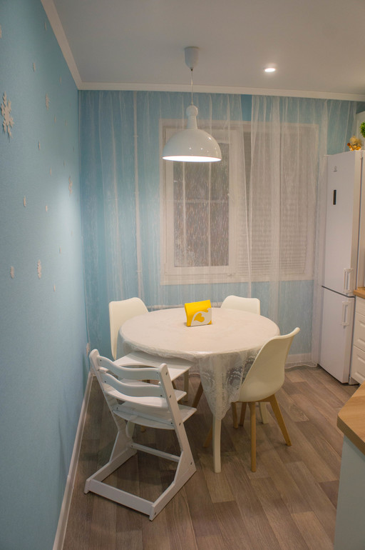 Круглый стол - моя мечта всей жизни! Всегда его хотела! А тут кухня хоть маленькая, но так удачно квадратная! А стулья оказались удобными на столько же, насколько они сейчас популярны )) Скатерть - вынужденная мера, с детьми иначе не получается. Кстати, лайфках, она перевернута на изнанку! Потому что лицевая сторона очень рельефная, оттуда потом ничего не вымыть!