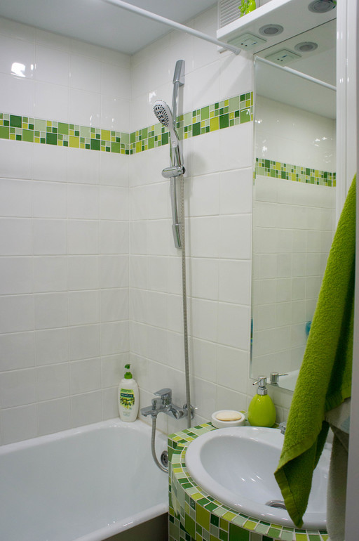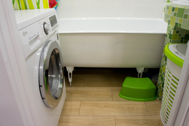 Основная проблема была в том, что любая стандартная мебель был меньше, чем пространство между ванной и стеной. А тут решалась проблема с зазорами, да еще и так весело ))