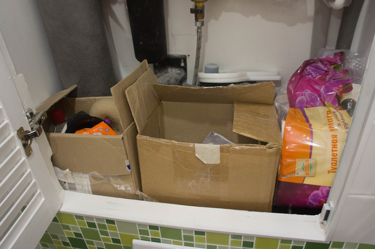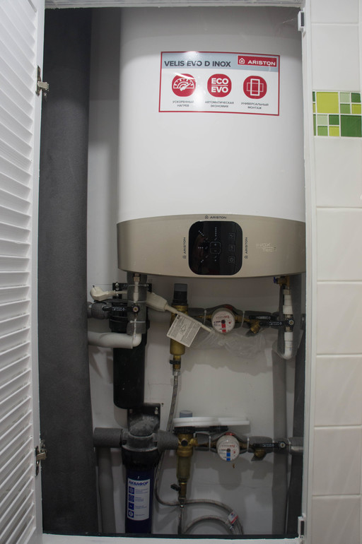 Кстати, инсталляцию мы искали очень низкую, наша от Алка - 85 см всего. Поэтому за дверцей поместились водонагреватель на 50 литров и система фильтров воды (такая же на кухне влезла в угловой кухонный шкаф).