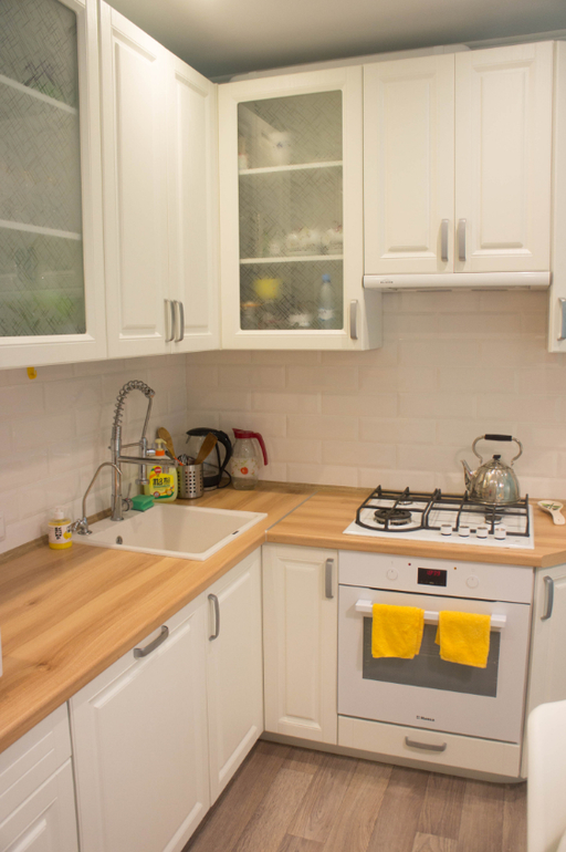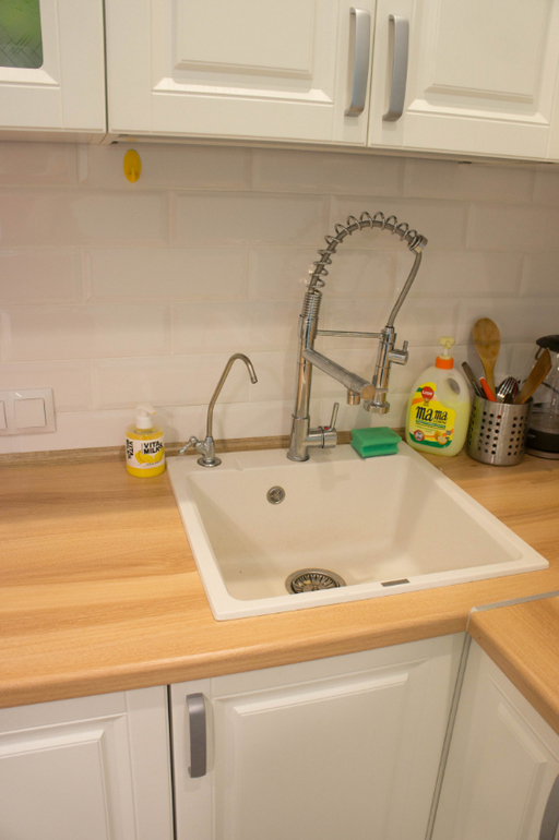 Сразу после входа так и тянет свернуть на кухню! Там уже набивший оскомину всем, кто сидит в сообществах дизайна, интерьерчик, но у меня и прошлая кухня была светлая, и тут я себе не изменила! Но кабанчик - это желание мужа )) Я хотела другую плитку на фартук, но уступила. Кран, кстати, тоже его креатив!