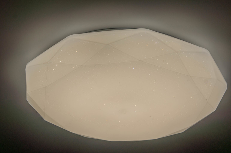 И еще у сына классная люстра, светодиодная плоская тарелка с легким блеском. Она регулируется по степени яркости и по теплоте: можно сделать совсем холодный, аж голубой свет, а можно теплый желтый. Мы любим дневной белый ))