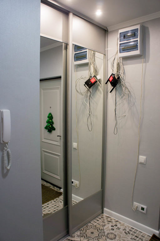 Справа живет шкаф-купе, исполняющий обязанности гардероба. А рядом с ним повисли лианы проводов, которые вот уже месяц муж никак не придумает, как убрать!