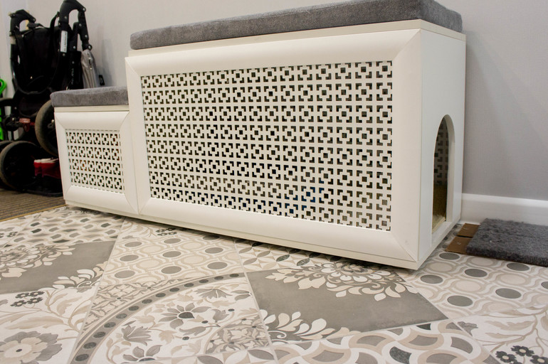 А слева тумба, он же кошачий дом.. Ну, не совсем дом, если быть честной )) Там прячется кошачий лоток! Тумбу делал мой муж по моим рисункам и размерам, подушки шила я сама, держутся они на липучках, приклеенных на тумбу и на дно подушек. Впереди и сзади, как вы догадались, экран для батарей ))