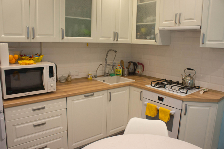 Микроволновку поменяем на маленькую, а может быть вообще пожертвуем каким-то фасадом сверху и сделаем встроенную.