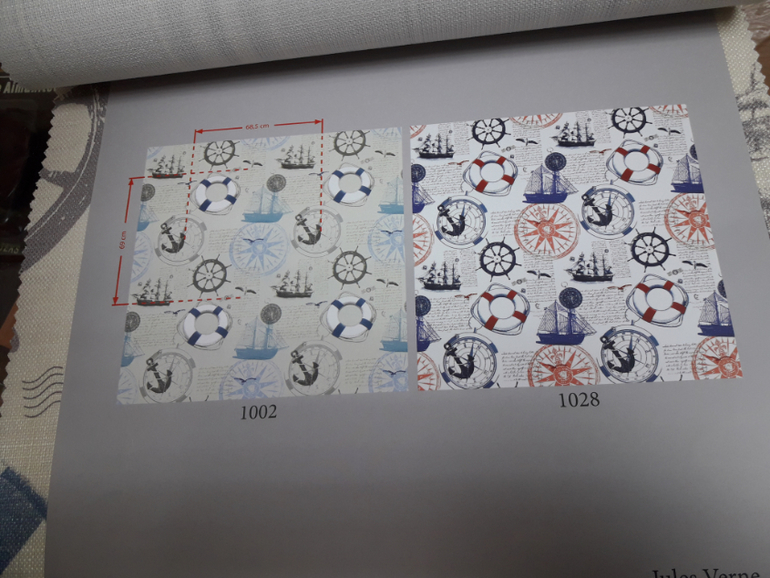 У готовых штор раппорт крупноват, они у Вас на фотографии фокусируют внимание на себя и "зажевывают" все пространство. И потом, такой фантазийный рисунок смотрится как произвольные чернильные пятна, что не очень подходит к "организованным" вертикальным полосам обоев. У 1002 и 10028, похоже, такая же проблема. Если у последней ткани вживую не слишком крупный узор, то мне кажется, она подойдет лучше, и синий цвет будет хорошим акцентом.
