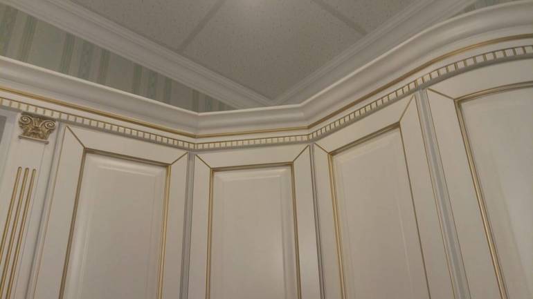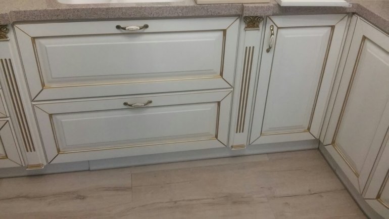 Девочки. Всем доброго дня. Выбрала фасады на кухню в классике, светлая с легким золотым патинированим (Примерный вариант на фото). Сама кухня (комната), удлиненная5300*2800, на северной стороне, т.е. солнца там не так много. Общий интерьер в легкой классике, дверь темная, плинтус под дверь, стены обои легкий беж. Столешница искуственный камень, тоже в очень легком тоне беж. Присмотрела размер (20*60), есть более кремовый оттеннок или белый. Что подскажите, какой вариант более подойдет? Какая плитка на пол больше подойдет? Спасибо всем, кто уделил время.