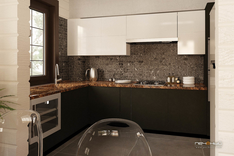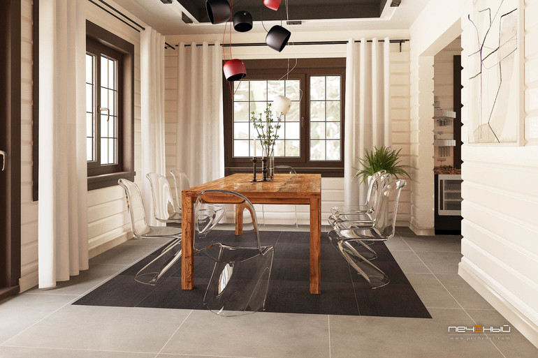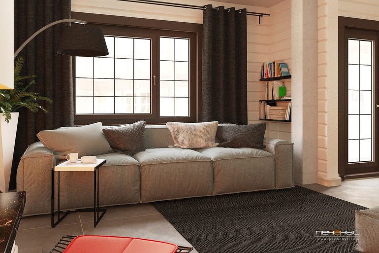 Почему-то, когда люди слышат про дизайн деревянного дома, они часто представляют себе какую-то баню с брусчатыми стенами. Дерево - очень мощная текстура, и четыре деревянные стены могут тяжело восприниматься визуально. В кухне-гостиной мы использовали светлую покрывную краску для брусьев, чтобы избежать эффекта давления и поддержать современный стиль. Из этих же соображений, кстати, стена за камином покрыта декоративной штукатуркой под бетон.