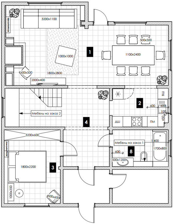 На первом этаже - гостиная, столовая, кухня, санузел и спальня заказчиков - родителей семейства. На втором этаже две детские - отдельная для старшего сына-подростка и общая для младших ребят, второй санузел и ещё две жилые комнаты, с которыми мы не работали. Площадь дома около 180 кв.м. Перепланировку не делали, расположение комнат осталось тем же, что и при покупке.