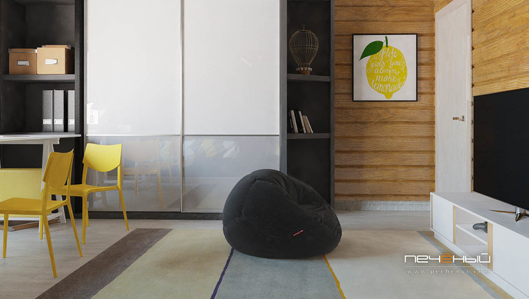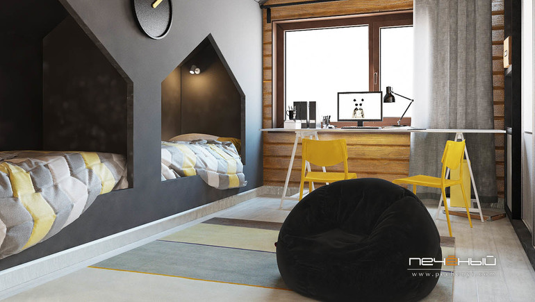 Наверняка найдутся те, кто скажет, что выбранные цвета для детской - слишком мрачные. В этом дизайн-проекте дети тоже участвовали в обсуждении, так что она подходит ребятам, для которых мы её создавали. Здесь реализована клёвая идея с кроватями в нишах. Кстати, в перегородке между ними есть окно, так что дети не совсем разделены. :)