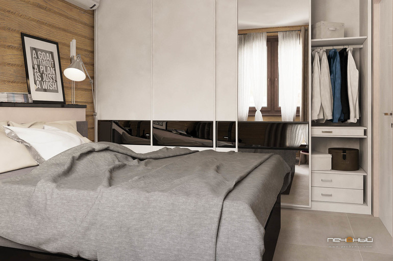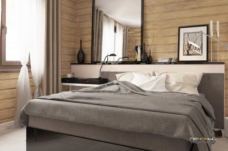 Деревянные текстуры добавляют натуральности, которая очень уместна в спальне. Красить стены в светлый не стали - это же всё-таки деревянныйдом! :) Добавлю пару слов о мебели. Современный стиль любит простые линии, поэтому все предметы здесь тоже лаконичны. Белый шкаф на всю стену разбавляет интерьер, благодаря ему нет ощущения, что находишься в «деревянной коробочке».