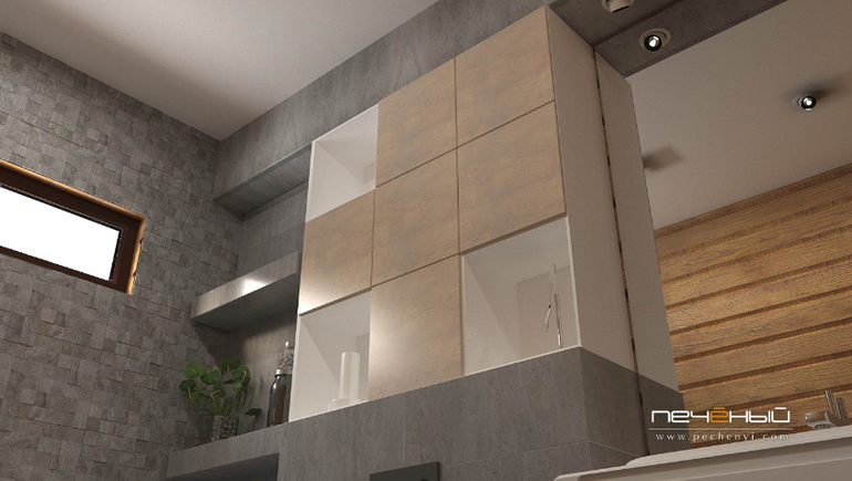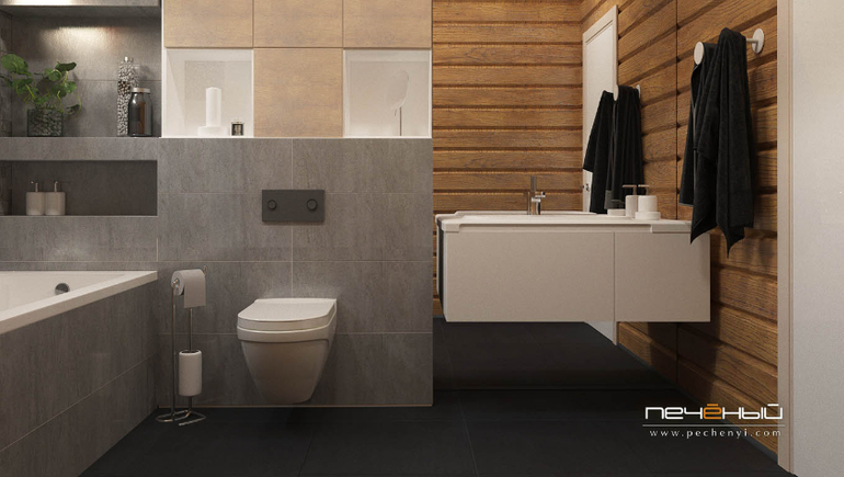 Мне нравится, как здесь смотрятся деревянные текстуры. Главное, выбрать правильную пропитку, чтобы брусья не портились от влажности. А ещё в этом санузле нет стандартных навесных шкафчиков, мебель сделана на заказ. Трубы скрыты в коробе, в нём же сделаны полки-ниши.