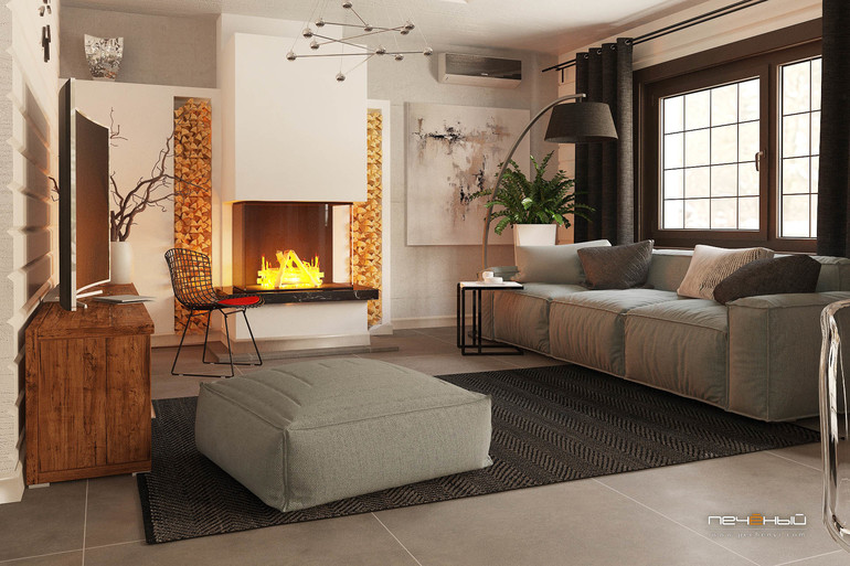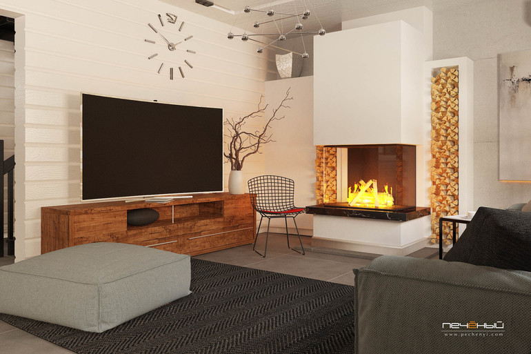 До начала работы в доме уже был камин, который нужно было вписать в помещение. Конструкция объёмная, да ещё и расположена была не по центру гостиной. Мы решили обыграть асимметрию и уравновесили композицию с помощью гипсокартонных коробов для хранения дров.