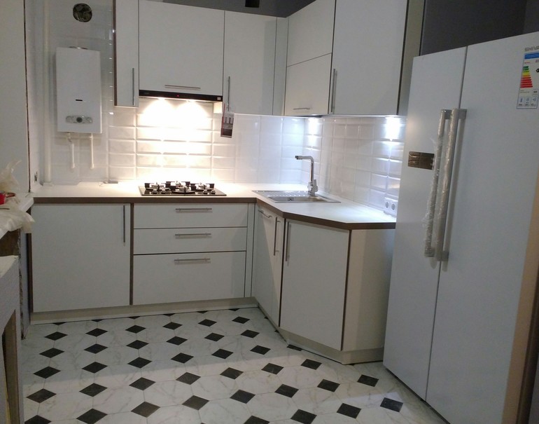 Сама кухня небольшая всего 6 метров. Мы объединили её с комнатой и в итоге получилась кухня гостиная площади 15м.там где был раньше проходить теперь ниша с холодильником.